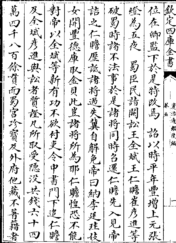 位在卿监下于是特改焉 诏以时平年丰增上元张灯为五夜 蜀臣民诣阙讼王全斌王仁赡崔彦进等