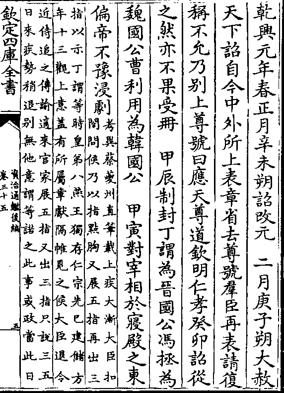 乾兴元年春正月辛未朔诏改元 二月庚子朔大赦天下诏自今中外所上表章省去尊号群臣再表请复