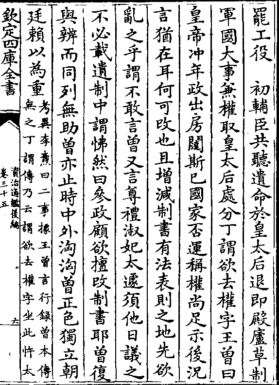 罢工役 初辅臣共听遗命于皇太后退即殿庐草制军国大事兼权取皇太后处分丁谓欲去权字王曾曰