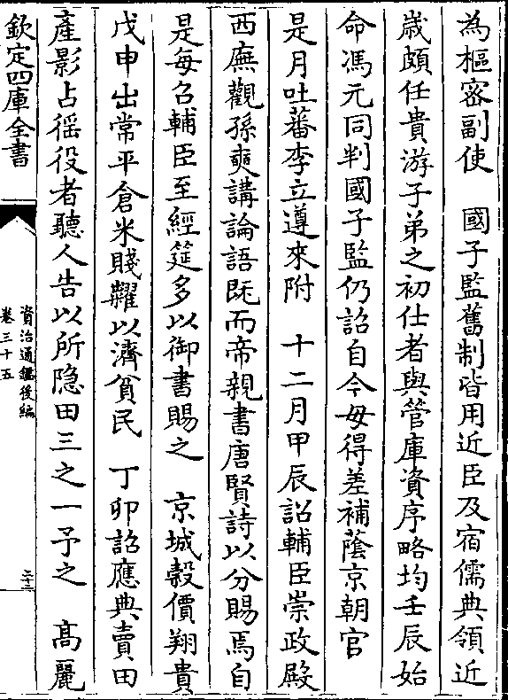 为枢密副使 国子监旧制皆用近臣及宿儒典领近岁颇任贵游子弟之初仕者与管库资序略均壬辰始