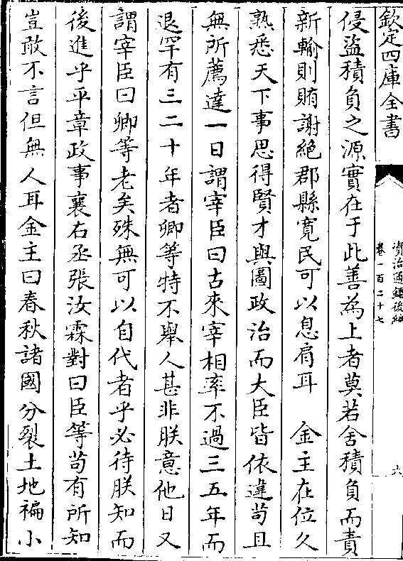 侵盗积负之源实在于此善为上者莫若舍积负而责新输则贿谢绝郡县宽民可以息肩耳 金主在位久