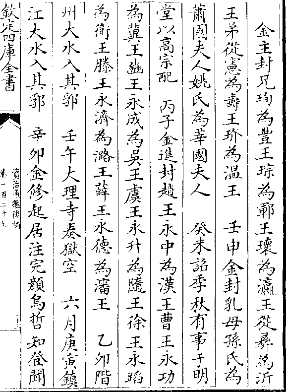 金主封兄珣为丰王琮为郓王瑰为瀛王从彝为沂王弟从宪为寿王玠为温王 壬申金封乳母孙氏为