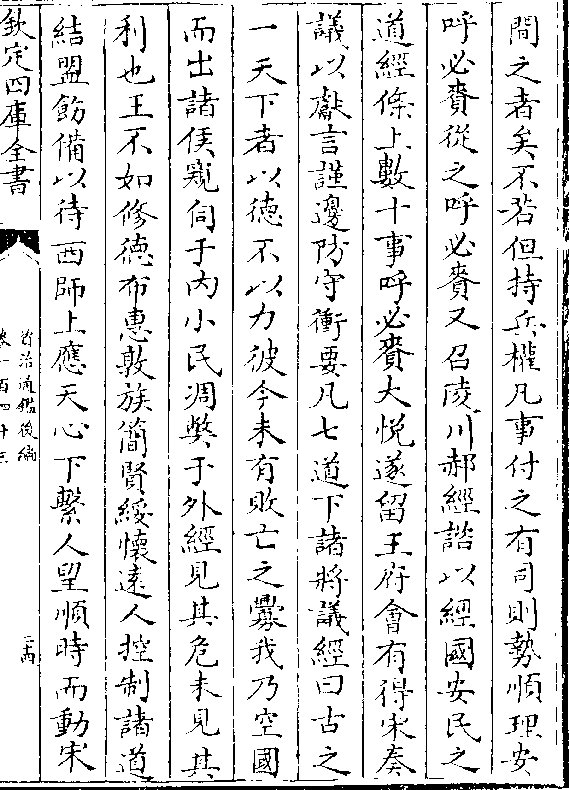 间之者矣不若但持兵权凡事付之有司则势顺理安呼必赉从之呼必赉又召陵川郝经咨以经国安民之