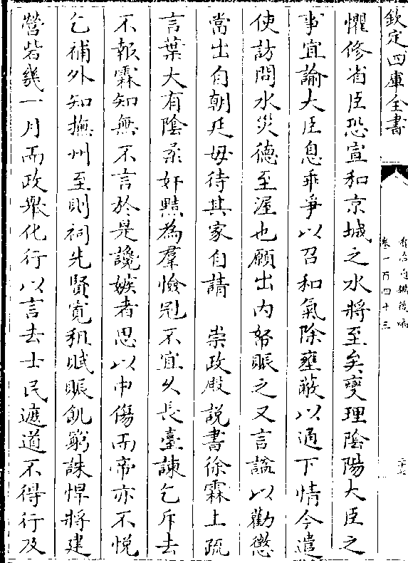 惧修省臣恐宣和京城之水将至矣燮理阴阳大臣之事宜谕大臣息乖争以召和气除壅蔽以通下情今遣