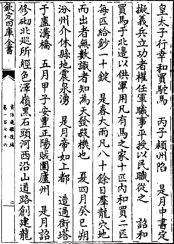 皇太子行幸和买驼马 丙子颍州陷 是月中书定拟义兵立功者权任军职事平授以民职从之 诏和