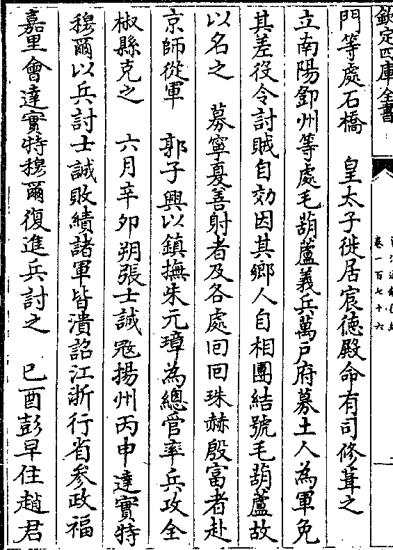 门等处石桥 皇太子徙居宸德殿命有司修葺之立南阳邓州等处毛萌芦义兵万户府募土人为军免
