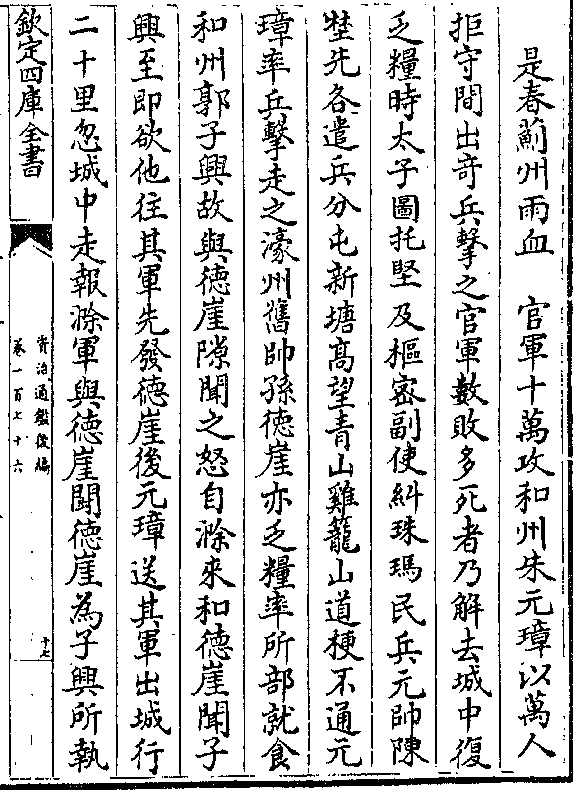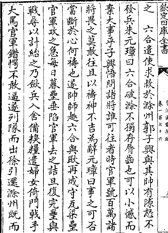 之 六合遣使求救于滁州郭子兴与其帅有隙怒不发兵朱元璋曰六合破滁不独存唇齿也可以小憾而