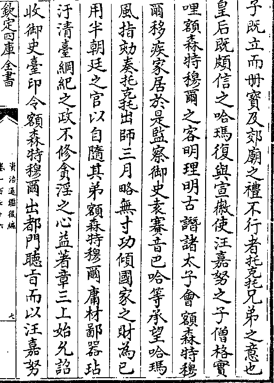 子既立而册宝及郊庙之礼不行者托克托兄弟之意也皇后既颇信之哈玛复与宣徽使汪嘉努之子僧格实