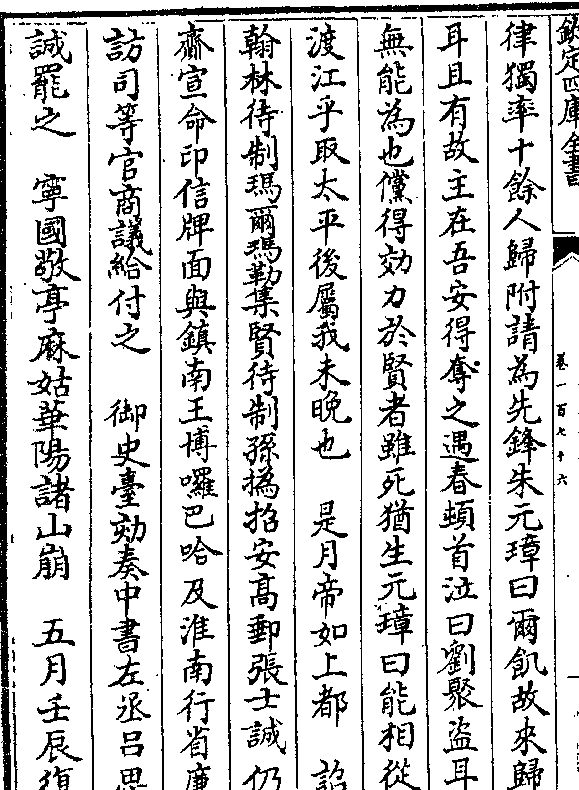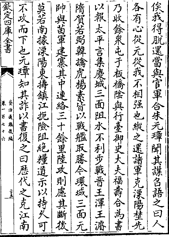 俟我得脱还当与官军合朱元璋闻其谋召语之曰人各有心从元从我不相强也纵之还诸军克溧阳野先