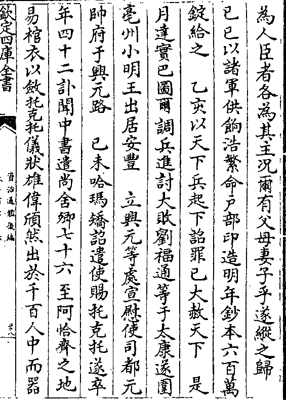 为人臣者各为其主况尔有父母妻子乎遂纵之归己巳以诸军供饷浩繁命户部印造明年钞本六百万