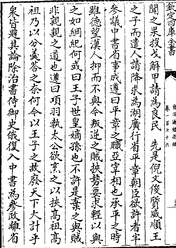 闻之果投戈解甲请为良民 先是倪文俊质威顺王之子而遣人请降求为湖广行省平章朝臣欲许者半