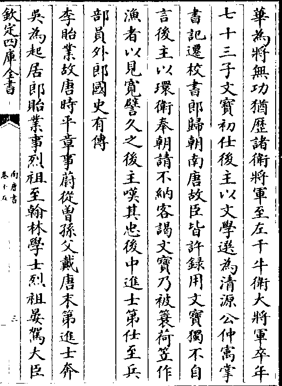 华为将无功犹历诸卫将军至左千牛卫大将军七十三子文宝初仕后主以文学选为清源公仲宇掌