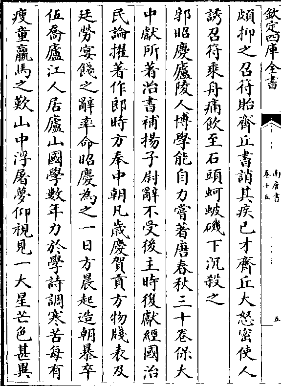 颇抑之召符贻齐丘书诮其疾已才齐丘大怒密使人郭昭庆庐陵人博学能自力尝著唐春秋三十卷保大
