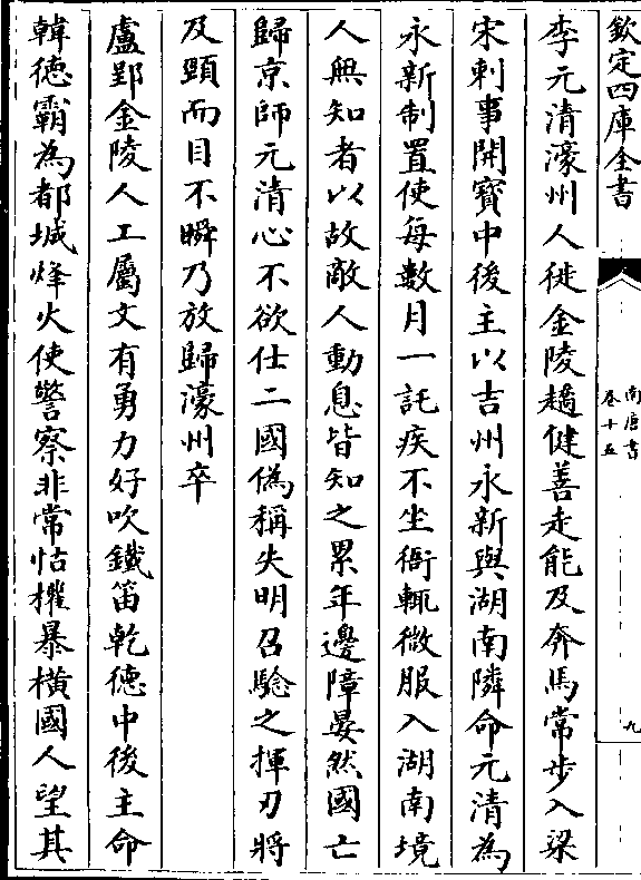 李元清濠州人徙金陵趫健善走能及奔马常步入梁宋刺事开宝中后主以吉州永新与湖南邻命元清为