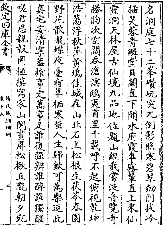名洞庭七十二峰巑岏突兀倒影照寒碧翠剑削拔冷插芙蓉青鳞堂贝阙直下开水府霞车雾辇直上来仙