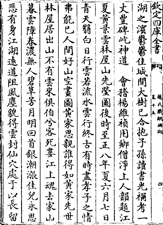 湖之滨郁郁佳城间大树已合抱子孙读书光祢考一丈丰碑屹神道 会稽杨维祯用乡僧净上人韵题江