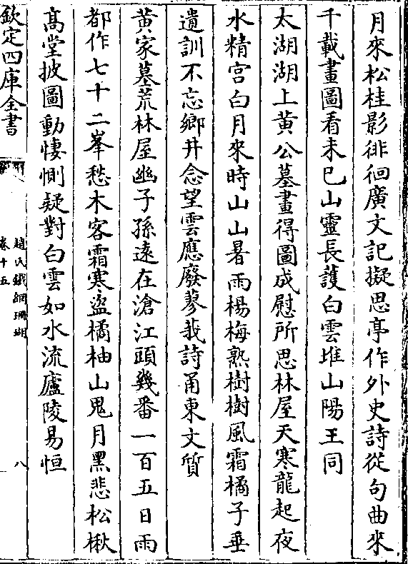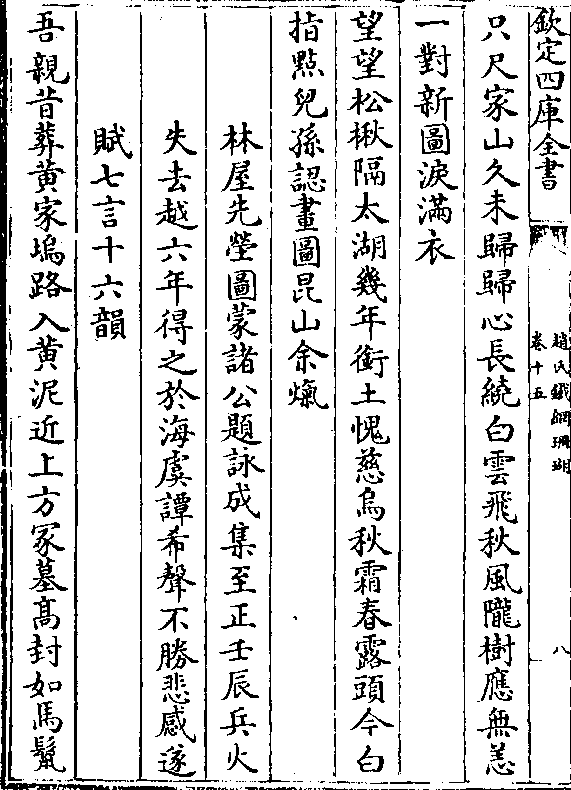 先茔林屋远绝景画图新巢树慈乌集穿花野鹿驯山云愁望极江月梦来频耿耿思亲念茫茫愧客身昆山