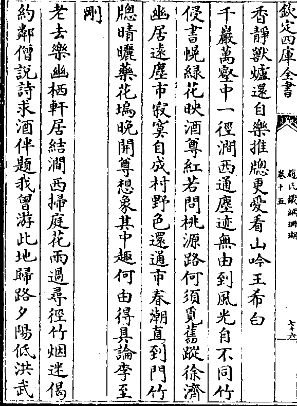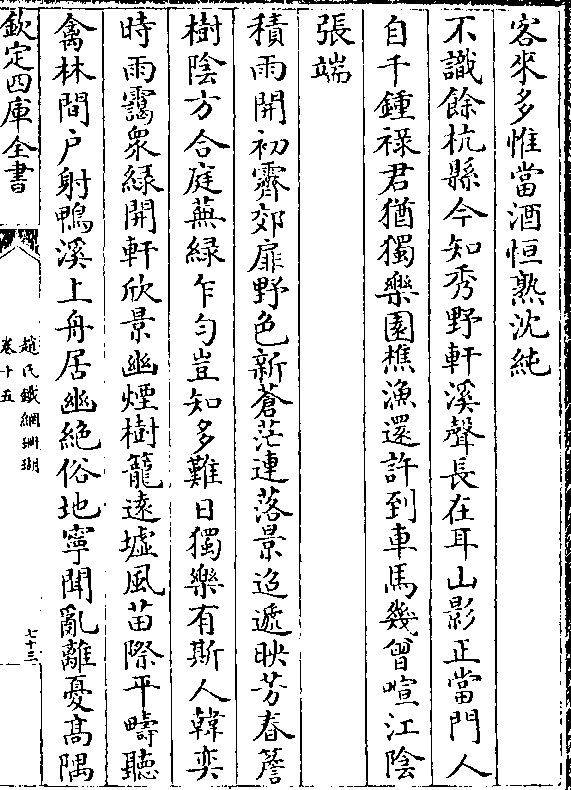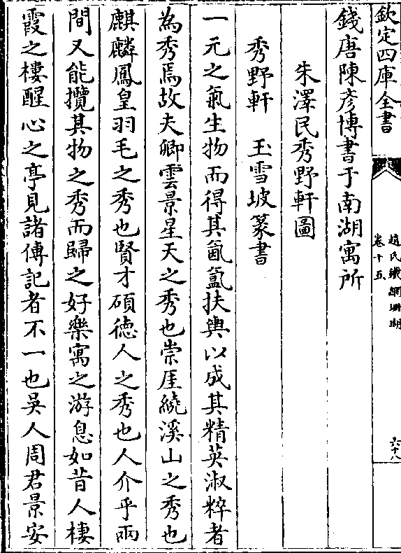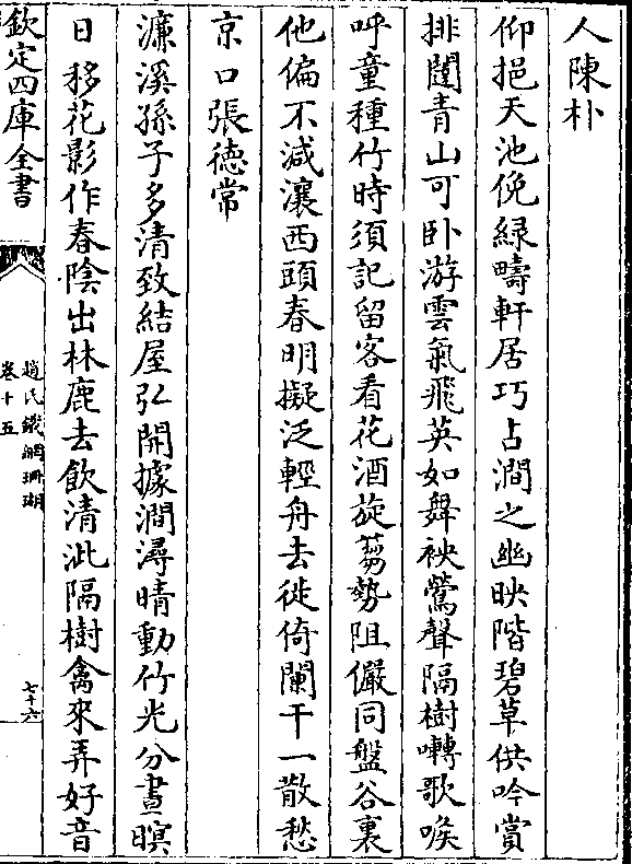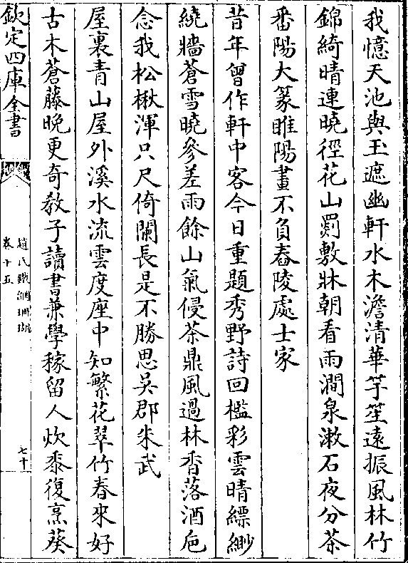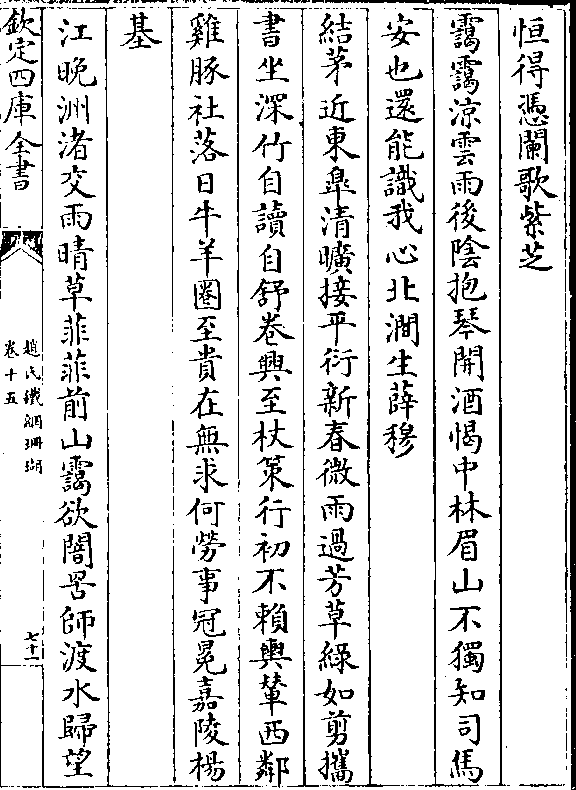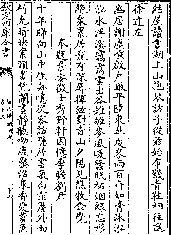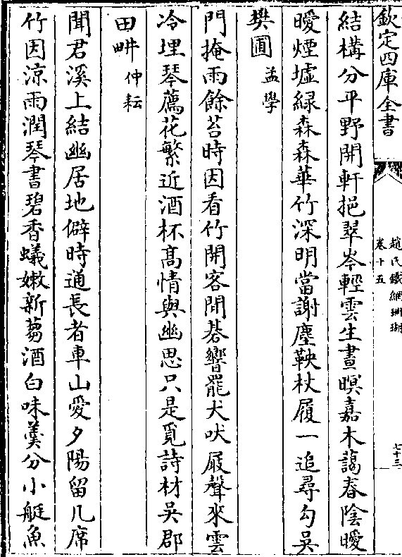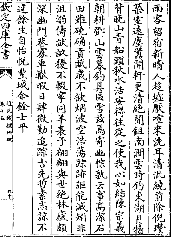 雨客留宿新晴人趁墟厌喧来洗耳清泚绕前除倪瓒筑室远尘嚣开轩更清绝閒锄南涧云时钓东湖月犊