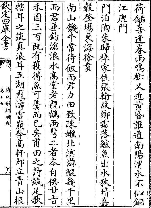 荷锸喜逢春雨鸣榔又近黄昏谁道南阳渭水不似铜江鹿门