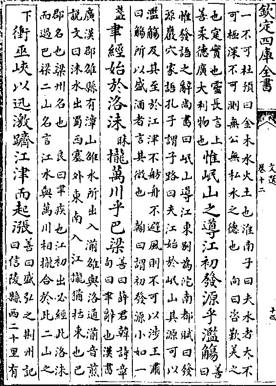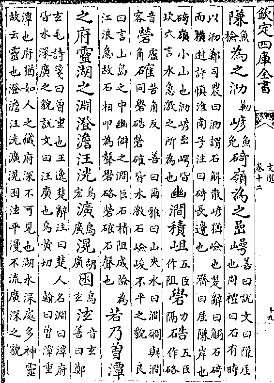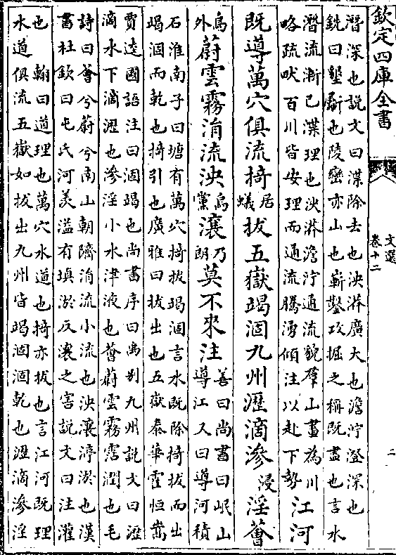 (潜深也说文曰渫除去也泱漭广大也澹泞澄深也水/铣曰垦斸也陵峦亦山也崭凿攻掘之称既尽也言)(潜流渐已渫理也泱漭澹泞通流貌群山画为川/略疏畎百川皆安理而通流腾涌倾注以赴下势)江河