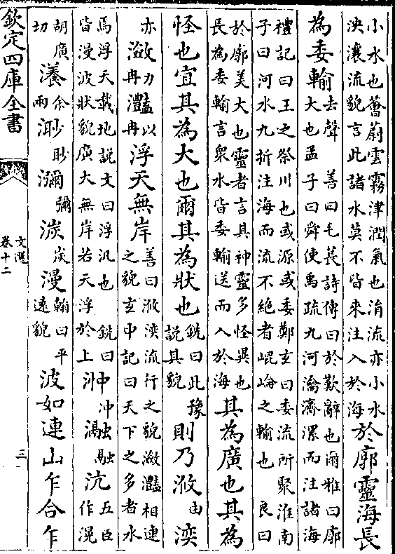 (小水也荟蔚云雾津润气也涓流亦小水/泱瀼流貌言此诸水莫不皆来注入于海)于廓灵海长为委输(去声孟善曰毛苌诗传曰于叹辞也尔雅曰廓/大也 子曰舜使禹疏九河瀹济漯而注诸海)