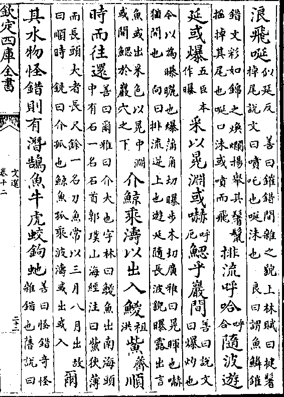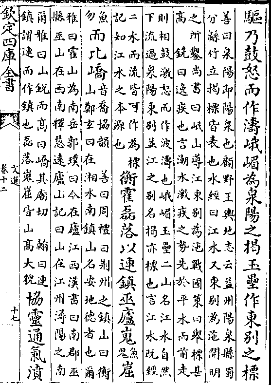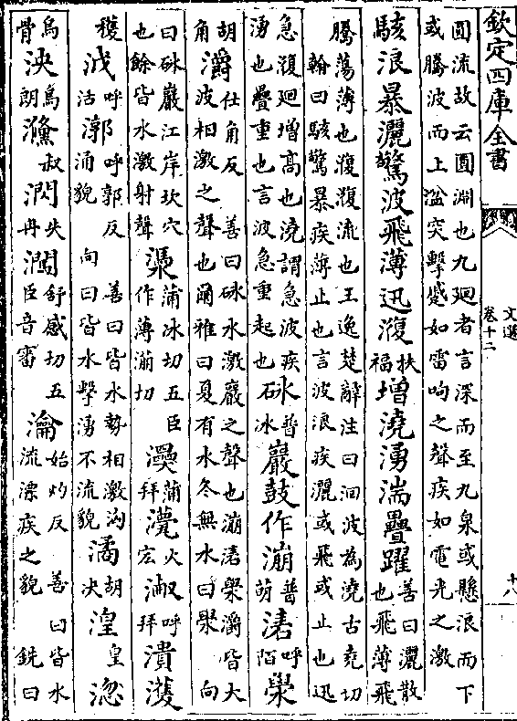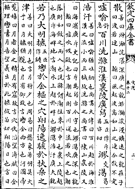 散(善曰浺瀜沆瀁深广之貌渺瀰湠漫旷远之貌庄子/曰波若连山 翰曰风起波高如山之连合散不嘘噏(许/急)百川洗涤淮汉襄陵广舄(五臣作斥/昌亦切)㶀(交/)㵧(葛/)
