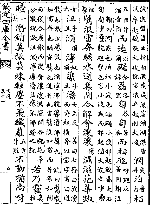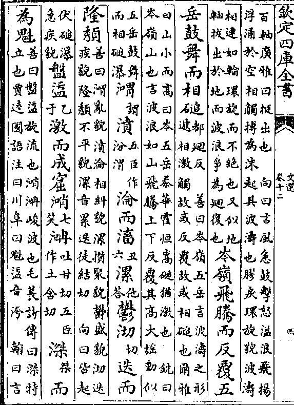 (百轴广雅曰梃出也沫向曰言风急鼓击怒溢浪飞扬/浮涌于空相触搏为 起其波涛也胶戾环旋貌波涛)(相连如轮环旋而不绝也又似地/轴拔出于地而波浪争为回复也)岑岭飞腾而反覆五