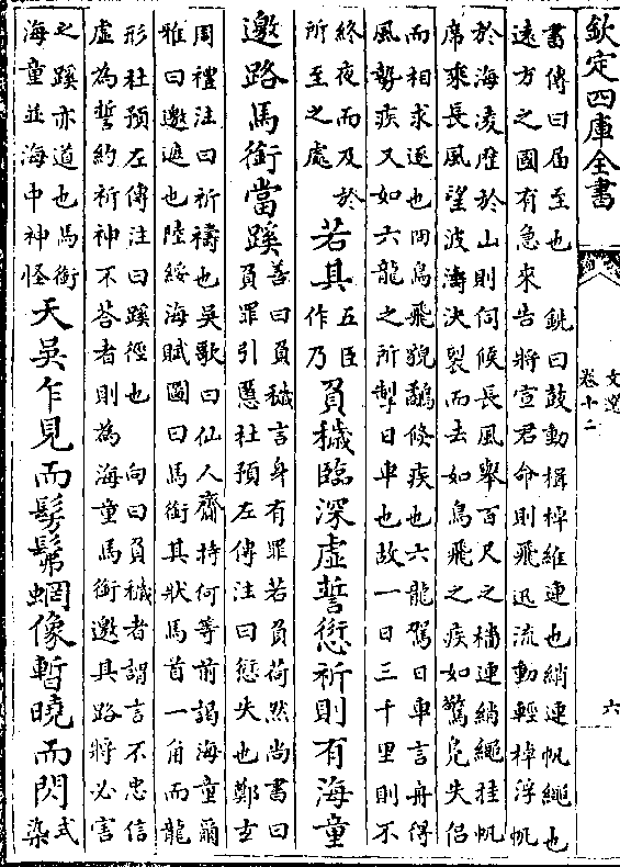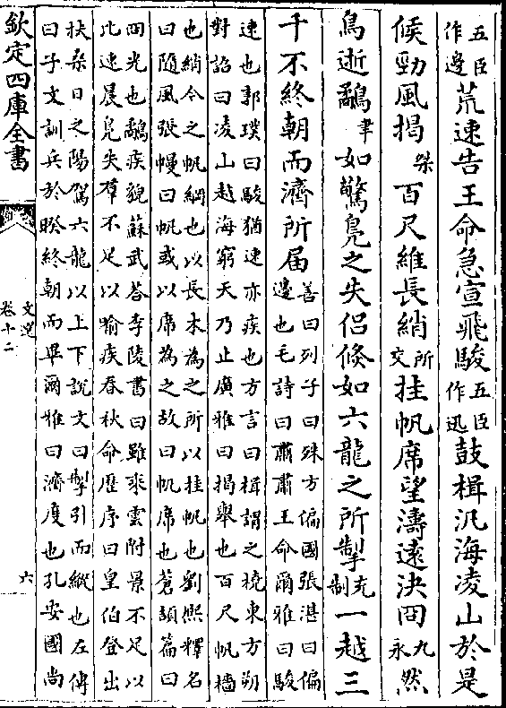 (五臣/作边)荒速告王命急宣飞骏(五臣/作迅)鼓楫汎海凌山于是候劲风揭(桀/)百尺维长绡(所/交)挂帆席望涛远决囧(九/永)然