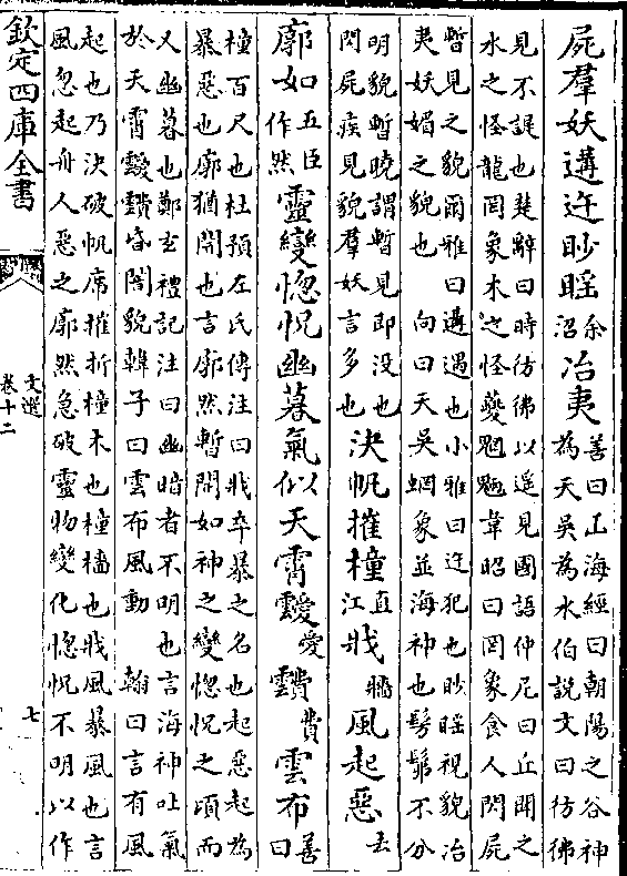 尸群妖遘迕眇䁘(余/沼)冶夷(善曰山海经曰朝阳之谷神/为天吴为水伯说文曰彷佛)(见不諟也楚辞曰时彷佛以遥见国语仲尼曰丘闻之/水之怪龙罔象木之怪夔魍魉韦昭曰罔象食人闪尸)