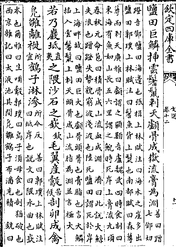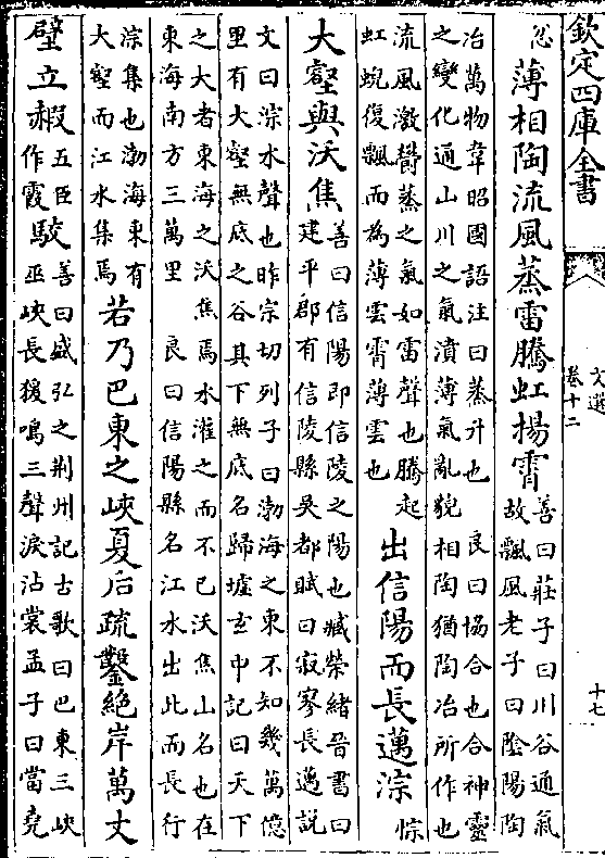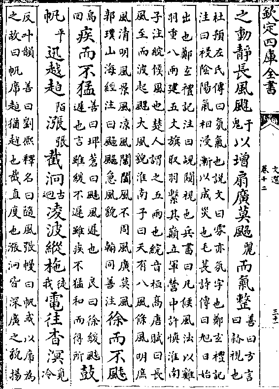 之动静长风颹(于/鬼)以增扇广莫䬅(丽/)而气整(善曰方言/曰□视也)(杜预左氏传曰氛气也说文曰雰亦氛字也郑玄礼记/注曰祲阴阳气相浸渐以成灾也毛苌诗传曰旭日始)
