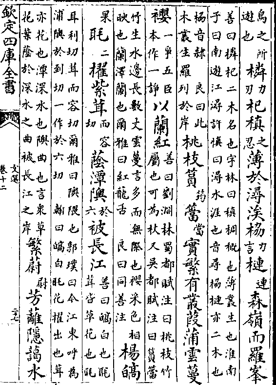 (曰埼曲岸头也淮南子曰夫歌采菱发阳阿楚辞曰渔/父鼓枻而去王逸曰叩船舷也 良曰同善注濑波也)(言钓鱼者或坐于悬岸之上或行于水/中波而船横旋也
