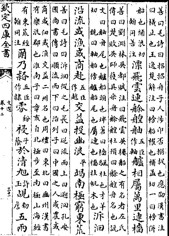 (善曰毛诗曰招招舟子人涉卬否搦捉也应劭汉书注/曰舣止也王逸楚辞注曰榜船棹也补孟切一曰榜并)(船也补浪切/ 翰同善注)漂飞云连艅艎舳(五臣/作轴)舻相属万里连樯