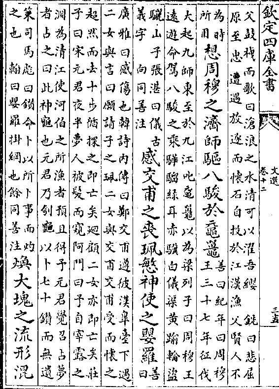 (父鼓枻而歌曰沧浪之水清可以濯吾缨父铣曰悲屈/原至忠遭遇放逐而怀石自投于江汉渔 贤人不)(为时/所用)想周穆之济师驱八骏于鼋鼍(善曰